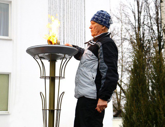 Огонь зимней отраслевой спартакиады было предоставлено лучшему спортсмену города, заслуженному тренеру Республики Беларусь, Почетному гражданину Климовщины Виктору Шапорову.