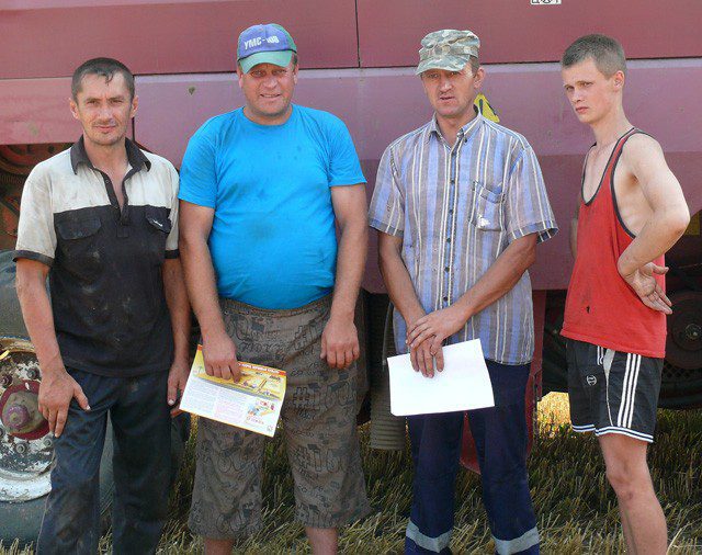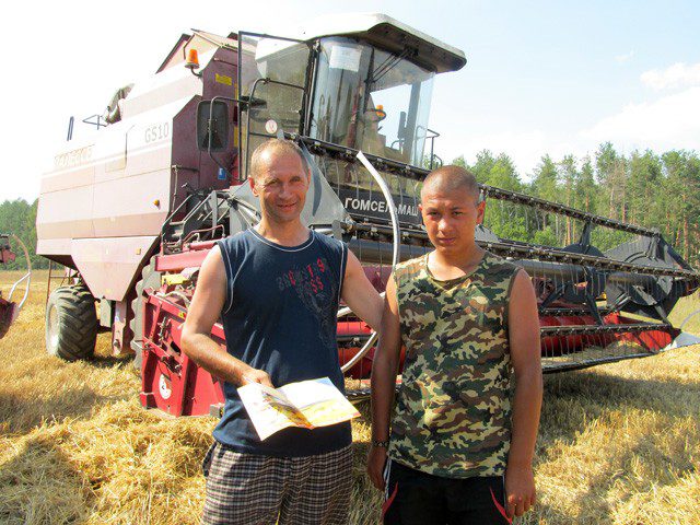 Эти комбайнеры дожинали поле под Лозовицей, где мы их с инспектором РОЧС Романом Песьковским и разыскали. Инспектор провел беседу с механизаторами и водителями, раздал памятки по пожарной безопасности. Мы убедились: водоподающая техника на поле дежурит (Александр Шпак), комбайнеры знают, что нужно делать в чрезвычайной ситуации.
