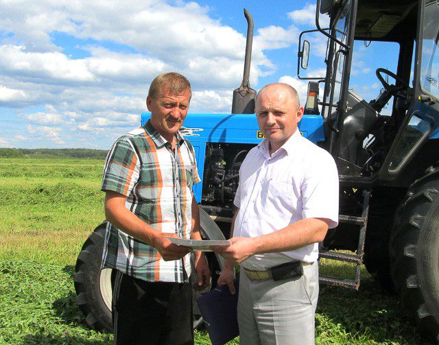 Первый визит мы нанесли в филиал «Приграничный» ОАО «Климовичский КХП». Здесь лидерами являлись: Леонид Лукашенко — подбор зеленой массы с измельчением, Сергей Ерошенко — сгребание и ворошение, Павел Тимошенко — отвозка сенажной массы.