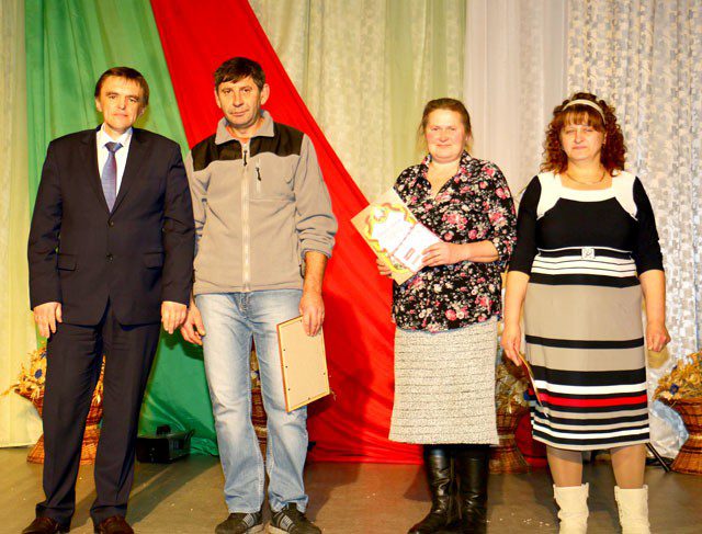Эту информацию собравшиеся в зале получили из видеофильма, подготовленного ОАО «Мир ТВ» Климовичи. А затем наступил самый торжественный момент — вручение наград. И первым приятную миссию выполнил Юрий Михайлович Демидов. От имени Могилевского облисполкома и управляющей компании «Могилевхлебопродукт» он поздравил тружеников агропрома Климовщины с наступающим праздником и вручил: Благодарственное письмо Могилевского областного исполнительного комитета — трактористу-машинисту ОАО «Племенной завод «Тимоново» Владимиру Сергеевичу Кустрееву, Почетную грамоту комитета по сельскому хозяйству и продовольствию Могилевского облисполкома — операторам машинного доения Оксане Владимировне Петуховой (ОАО «Племенной завод «Тимоново») и Галине Владимировне Селедцовой (филиал «Приграничный» ОАО «Климовичский комбинат хлебопродуктов»). Затем на сцену был приглашен первый заместитель председателя Климовичского районного исполнительного комитета — начальник управления сельского хозяйства и продовольствия Дмитрий Васильевич Мартинович. Он отметил, что это не только праздник работников сельского хозяйства и перерабатывающей промышленности, но и тружеников фермерских хозяйств, всех, кто работает на земле. Он поздравил с праздником также ветеранов сельскохозяйственного труда. А потом провел церемонию награждения победителей ежегодного районного соревнования среди сельскохозяйственных и иных организаций района, осуществляющих производство сельскохозяйственной продукции, их работников за достижение высоких показателей на заготовке травяных кормов в 2016 году.
