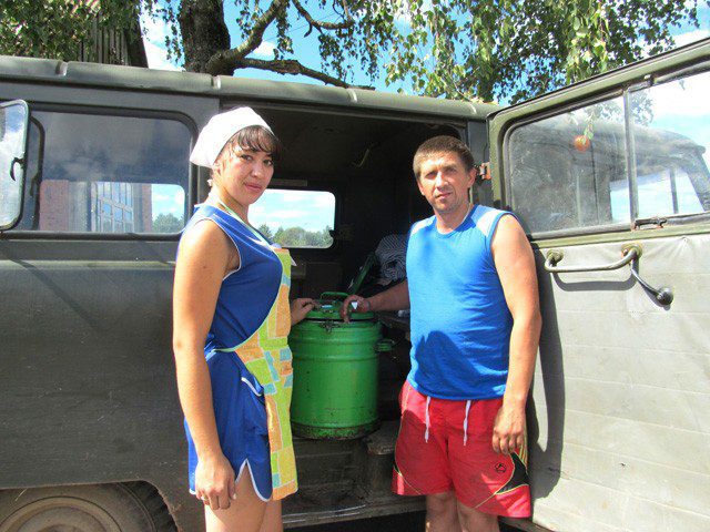 А вот и обеды привезли. Их доставляют водитель Юрий Минин и помощник повара Наталья Самосуева.