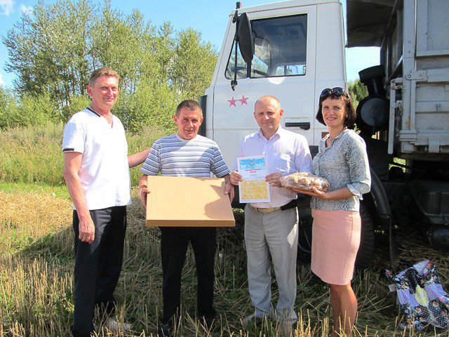 Одной из причин нашей поездки по полям стало награждение: первую тысячу тонн зерна нового урожая от комбайнов перевез водитель филиала «Приграничный» ОАО «Климовичский КХП» Владимир Стелькин. Две звездочки за каждые пятьсот тонн красуются теперь на кабине его МАЗа. Водитель принимал поздравления, Благодарственное письмо за подписью председателя райисполкома Василия Захаренко, каравай и подарок от районной организации ОО «Белая Русь».
