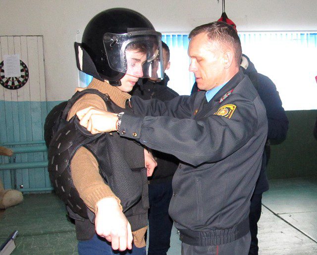 Для гостей была организована экскурсия по отделу: дежурная часть, комната для задержанных, спортивный зал, в котором сотрудники отрабатывают приемы рукопашного боя и самозащиты, а также поддерживают себя в отличной физической форме. Ребятам показали обмундирование и спецсредства, оружие, с которыми сотрудники проходят службу. Михаила Святославовича и старшего инспектора группы кадров райотдела Сергея Силкова об особенностях и применении спецоборудования расспрашивали не только мальчики, но и с немалым интересом — девочки. Желающие даже примерили элементы обмундирования.