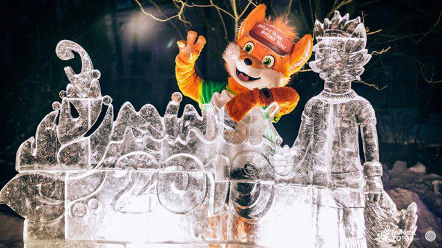 Презентация двухметровой ледяной композиции талисмана II Европейских игр Лисенка Лесика и логотипа Игр, стилизованного цветка папоротника, стала кульминацией фестиваля уличный забав «Зимние гуляния» в столичном парке «Дримлэнд», устроенного фондом «Дирекция II Европейских игр 2019 года».