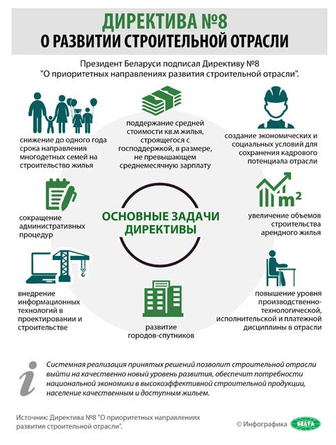Президент Беларуси Александр Лукашенко подписал Директиву №8 «О приоритетных направлениях развития строительной отрасли», в которой изложены решения, принятые 23 ноября 2018 года на республиканском семинаре-совещании.