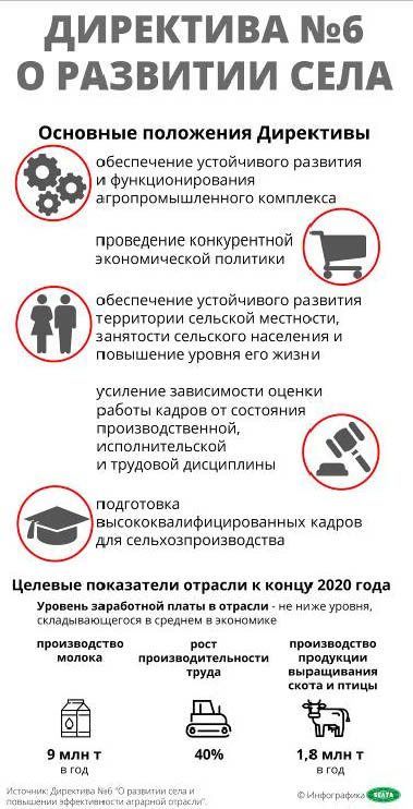 В качестве одного из направлений развития аграрной отрасли Директивой №6 закреплено достижение экономически целесообразных объемов производства. Они определены исходя из природного потенциала, производственных мощностей и технологических резервов. При выполнении установленных Директивой заданий к концу 2020 года объемы производства молока в стране должны достигнуть 9 млн т в год, продукции выращивания скота и птицы — 1,8 млн т.