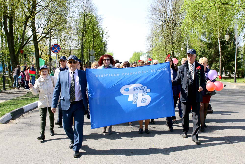 По традиции, в праздничной колонне по улице Советской прошли представители трудовых коллективов. Во главе колонны — духовой оркестр и профсоюзные лидеры. На площади всех приветствовали члены райисполкома.