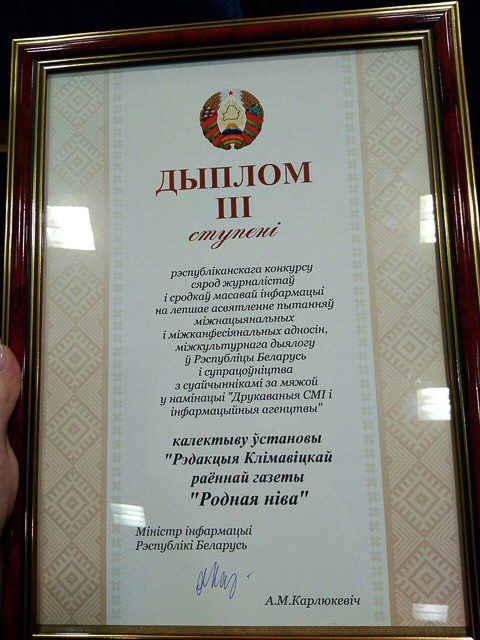 Информационное агентство «Могилевские ведомости» заняло 1-е место в конкурсе в номинации «Печатные СМИ и информационные агентства». В этой же номинации 3-е место у климовичской районной газеты «Родная ніва».