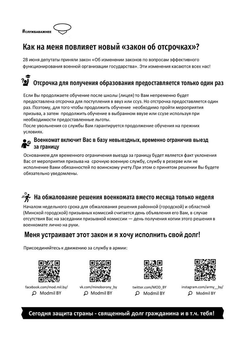 Закон и порядок Как повлияет новый «закон об отсрочках»? От Родная Нiва - 02.08.2019 28 июня депутаты приняли закон «Об изменении законов по вопросам эффективного функционирования военной организации государства». Эти изменения касаются всех нас!