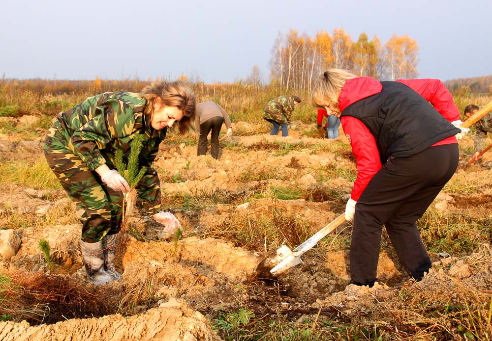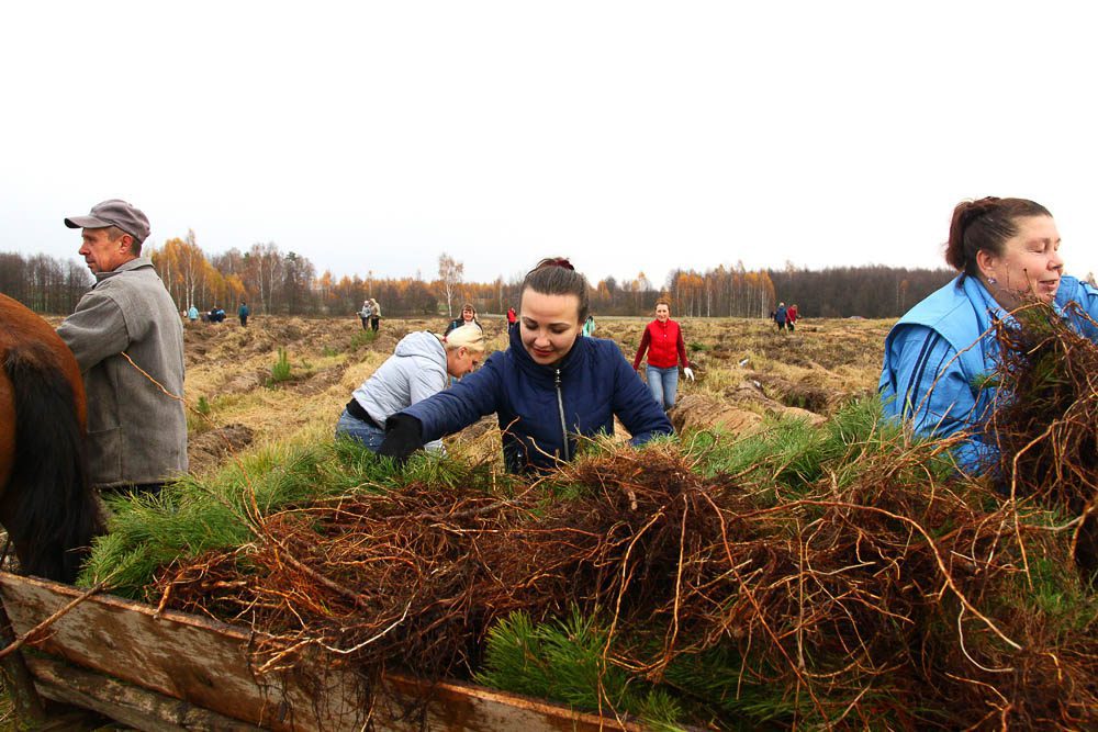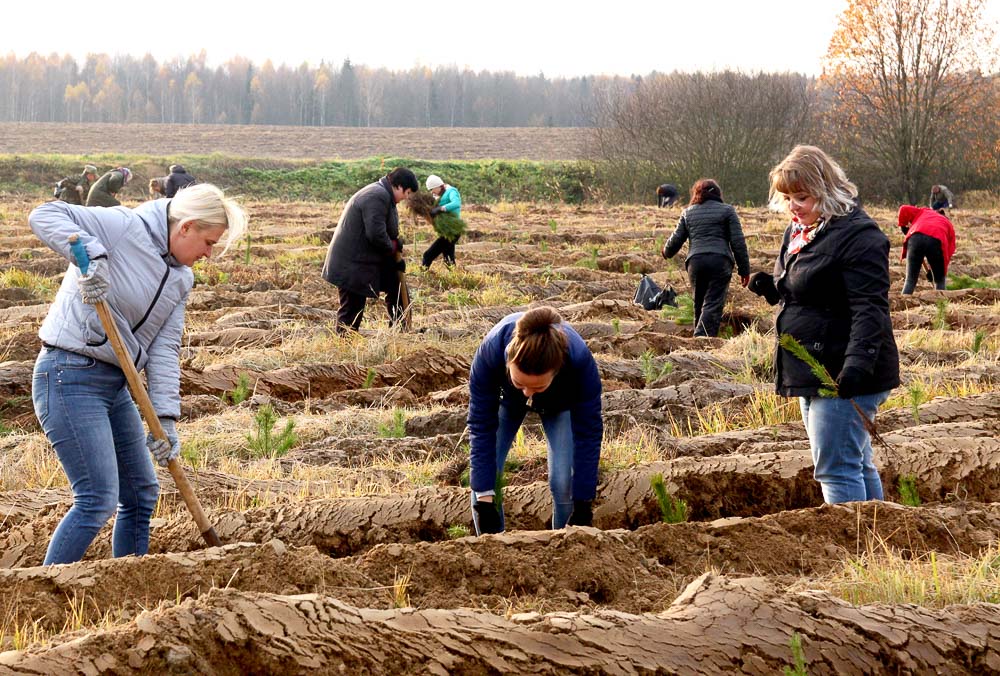 Работники райисполкома, учащиеся Климовичского государственного аграрного колледжа, представители организаций района на субботнике занимались посадкой молодого леса на территории бывшей свинофермы возле деревни Ледешня.