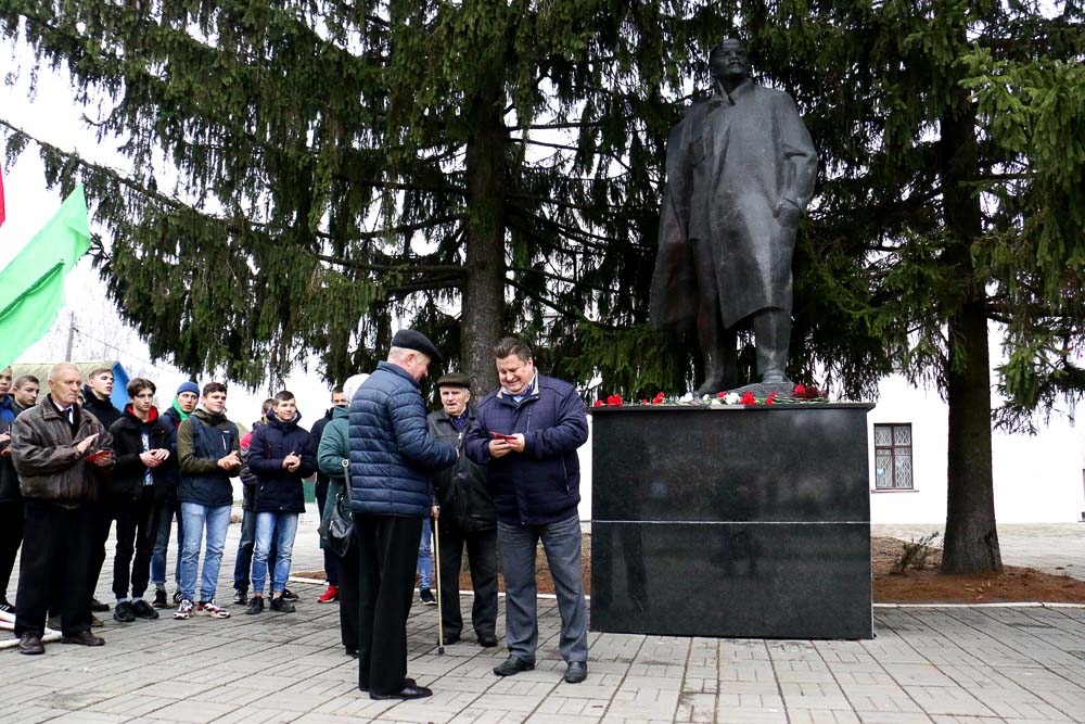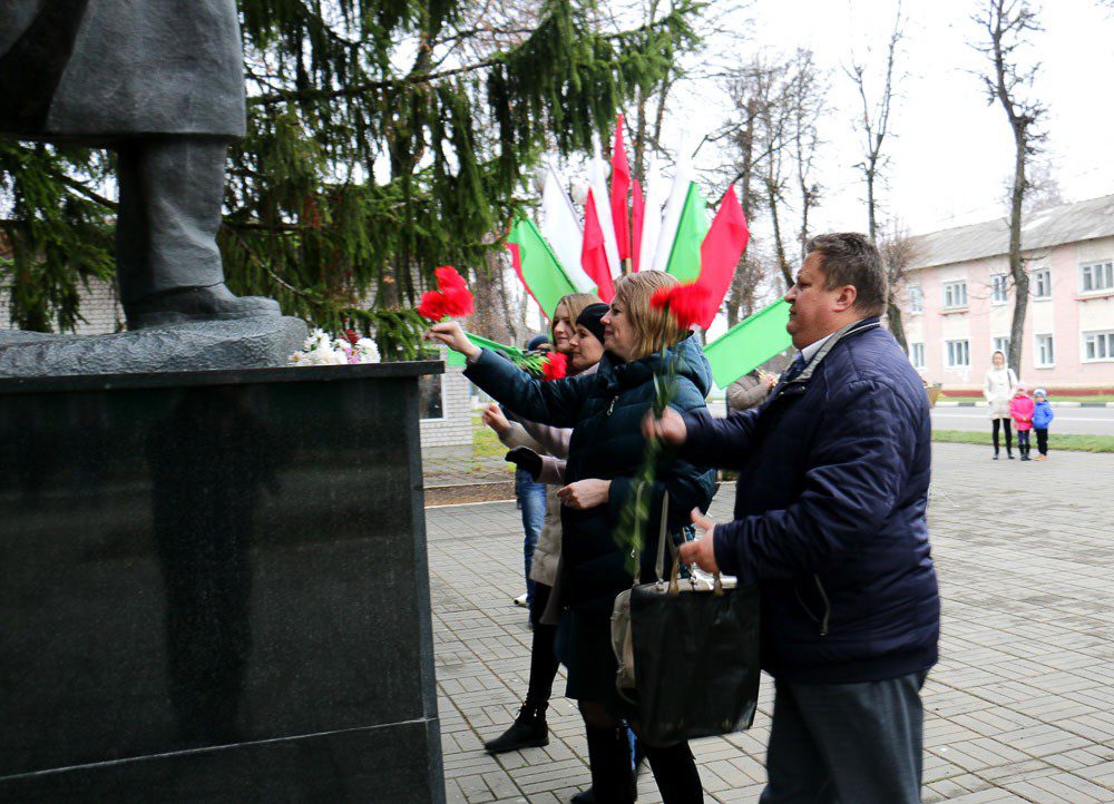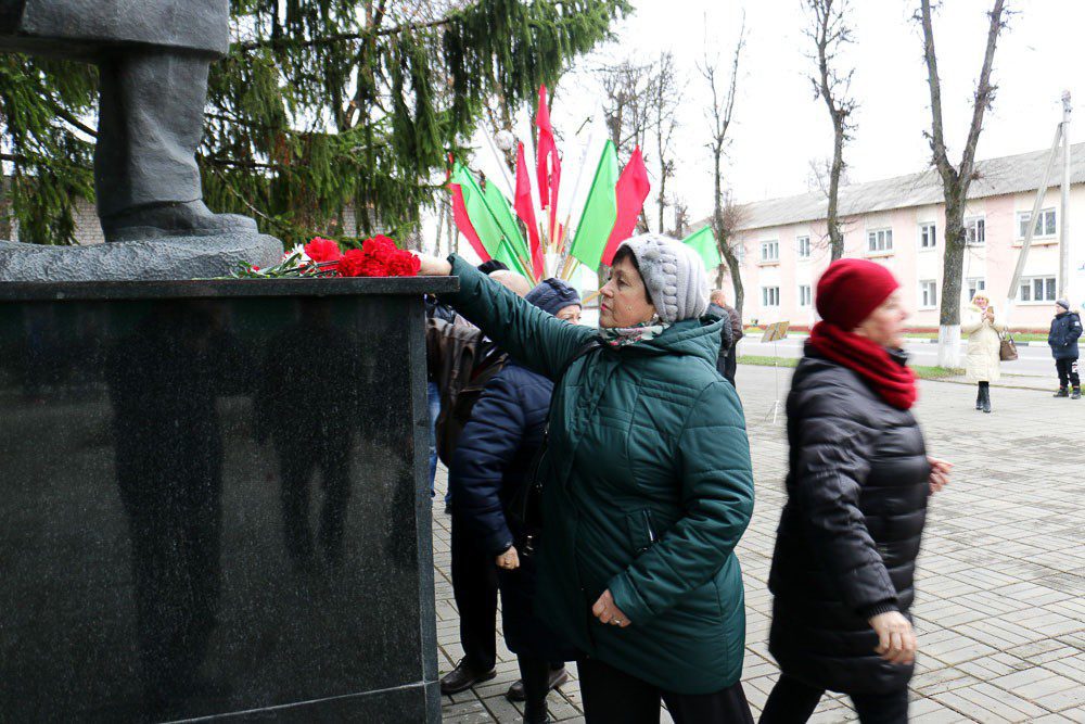 По традиции, у памятника Владимиру Ленину состоялся небольшой митинг. Представители организаций, члены коммунистической партии Беларуси, ветераны возложили цветы к монументу вождю революции.