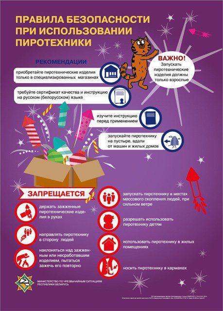 Покупка. В первую очередь, забудьте о пиротехнических изделиях из-под полы – покупайте их только в специализированных магазинах. Не соглашайтесь на более выгодные предложения – глаза и руки в случае возникновения нештатной ситуации обойдутся дороже. Попросите у продавца сертификат безопасности. Обратите внимание на срок годности (как правило, пиротехника хранится не более трех лет) и инструкцию (обязательно на белорусском или русском языке), которую необходимо изучить. Рассмотрите упаковку и само изделие: дефектов быть не должно, фитиль – заклеен или спрятан под обертку.