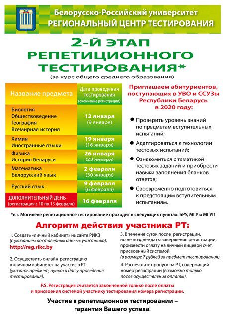 Второй этап репетиционного тестирования (РТ) за курс общего среднего образования стартует 12 января. Начало проведения тестирования по всем предметам в 11.00, сообщили в региональном центре тестирования Белорусско-Российского университета.