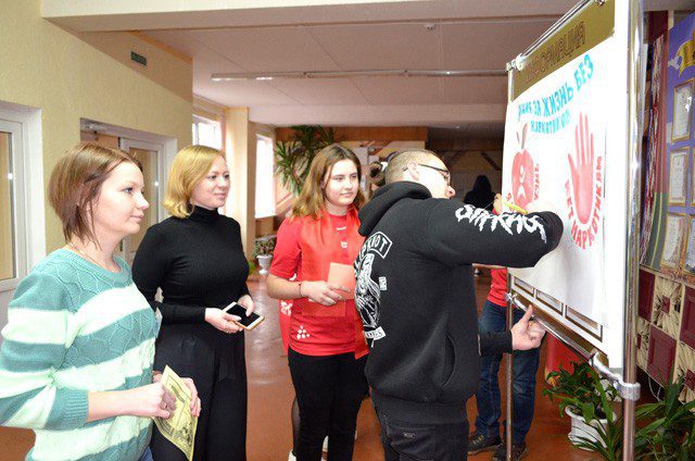 Молодежные активисты раздавали учащимся колледжа памятки, рассказывали о последствиях пагубных привычек, предлагали ребятам вместе создать плакат. На плакате каждый участник флэш-моба написал, почему он против наркотиков. И главное здесь то, что молодежь — против наркотиков, что наркотики не приемлемы для молодых людей.