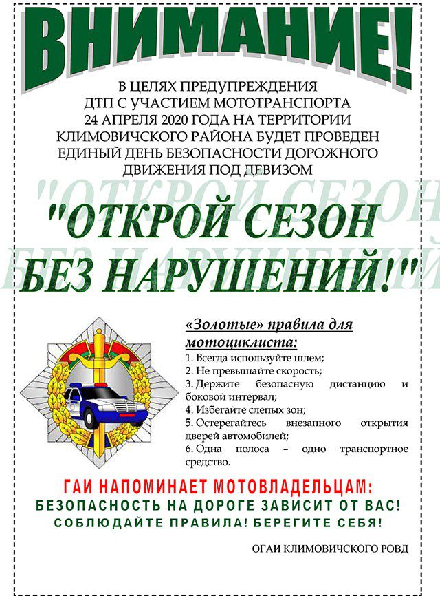 Как сообщил начальник ОГАИ Климовичского РОВД Алексей Леонтьев, на территории Климовичского района в 2019 году совершено 3 учетных дорожно-транспортных происшествия с участием водителей мототранспортных средств, в которых водители получили ранения различной степени тяжести, в т. ч. одно — водителем в состоянии алкогольного опьянения.