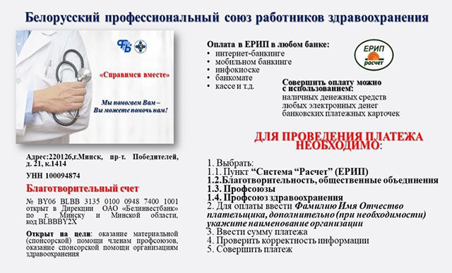 Номер благотворительного счета: BY06 BLBB 3135 0100 0948 7400 1001, открыт в Дирекции ОАО «Белинвестбанк» по г. Минску и Минской области, код BLBBBY2X, получатель средств – Белорусский профсоюз работников здравоохранения, УНП 100094874.
