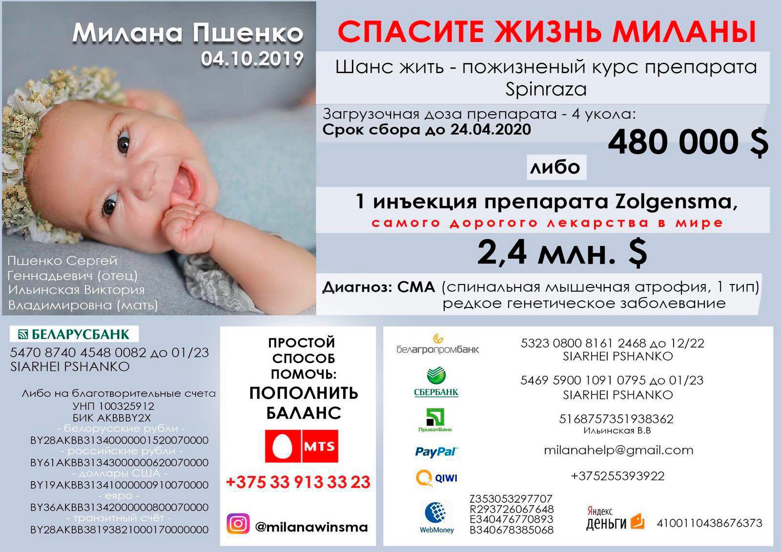 «Мы, Пшенко Сергей Геннадьевич и Ильинская Виктория Владимировна, родители Пшенко Миланы Сергеевны (04.10.2019г.р.), попали в трудную жизненную ситуацию. В нашу семью три месяца назад ворвалось несчастье, после рождения доченьки, Пшенко Миланы, ей было диагностировано страшнейшее генетическое заболевание, спинально-мышечная атрофия 1-го типа. Без необходимого лечения при этом заболевании постепенно атрофируются мышцы, ребёнок перестаёт двигать ножками, ручками, затем не сможет откашливаться и глотать и в терминальной стадии не сможет дышать. 1 тип самый агрессивный. Без лечения с таким заболеванием дети не доживают и до 2-х лет.