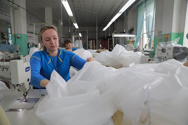 На снимке: производство костюмов биологической защиты для системы здравоохранения.