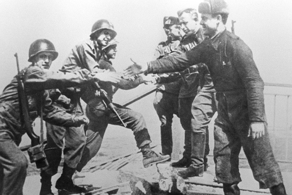 25 апреля 1945 года, 1404 день войны. Войска 1-го Белорусского фронта развивали в этот день успешное наступление. Советские танкисты и пехотинцы овладели городом Науон, расположенным северо-западнее Берлина. Затем наши войска нанесли удар в южном направлении и, продвинувшись вперед на 20 километров, перерезали все пути, идущие из Берлина на запад. Сегодня войска 1-го Белорусского фронта соединились с наступающими с юга войсками 1-го Украинского фронта и полностью окружили Берлин.