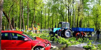 В Климовичах сломанное порывом ветра дерево упало на проезжавший мимо автомобиль