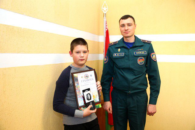 Начальник Климовичского РОЧС Дмитрий Жуков вручил Андрею грамоту, подписанную министром по чрезвычайным ситуациям Республики Беларусь Владимиром Ващенко и ценный приз. Дмитрий Евгеньевич пожелал Андрею успехов в учебе и творчестве.