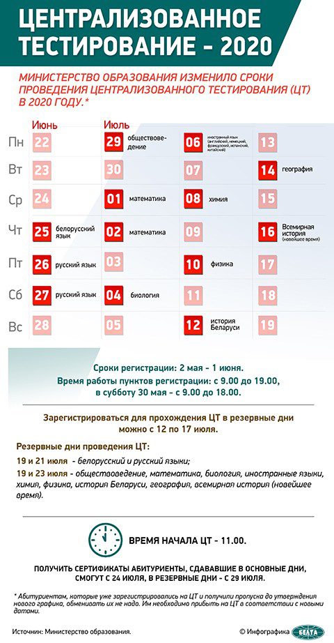 Министерство образования определило график проведения централизованного тестирования в резервные дни. Соответствующее постановление министерства от 20 мая 2020 года №93 официально опубликовано на Национальном правовом интернет-портале.