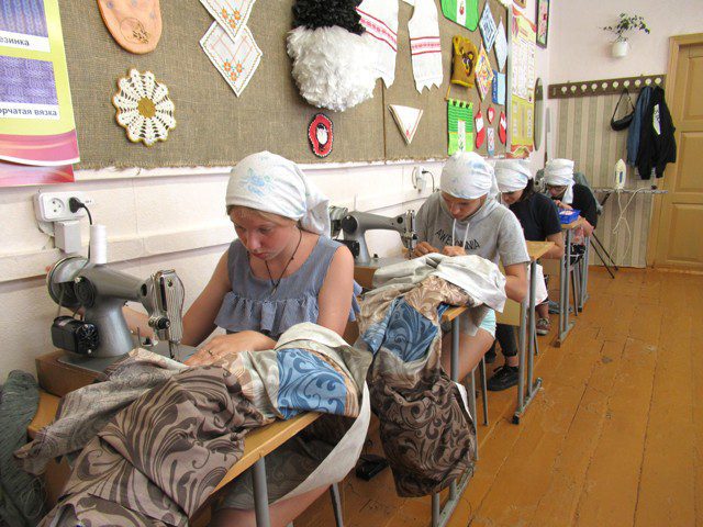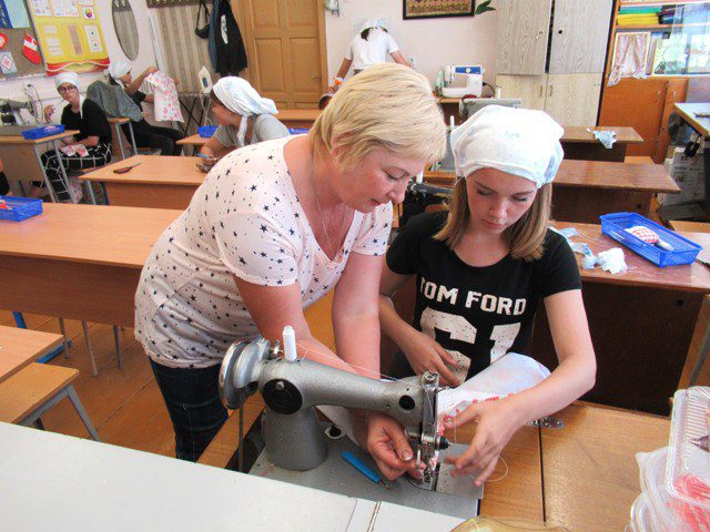 Всего здесь 15 человек: двенадцать девушек и трое парней. Парни и две девушки под руководством учителя физкультуры Алексея Владимировича Купцова занимаются благоустройством территории. У остальных девушек своя задача — они занимаются швейным делом: шьют постельное белье, полотенца, платки. Как рассказала учитель обслуживающего труда Алла Ивановна Езерская, которая руководит вторичной занятостью, ткань закупает отдел по образованию. Туда же сдают и готовые вещи.