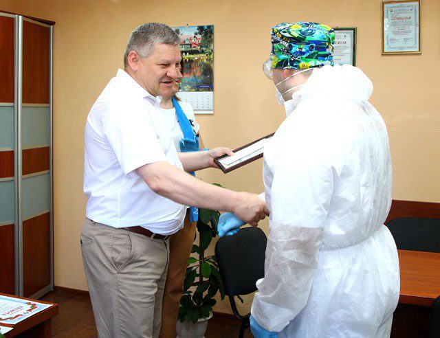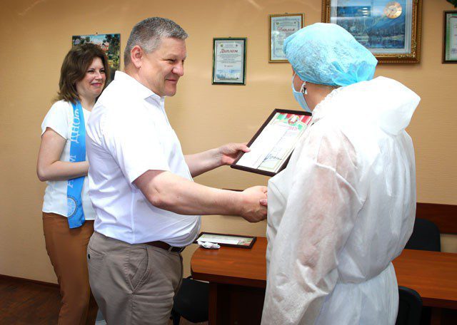 В этот же день Леонид Засемчук побывал в центральной районной больнице и поздравил с наступающим профессиональным праздником медицинских работников Климовщины. Благодарность райисполкома за многолетний добросовестный труд в системе здравоохранения фельдшеру выездной бригады отделения скорой медицинской помощи Дмитрию Королевичу и врачу-акушеру-гинекологу (заведующему) гинекологического отделения УЗ «Климовичская ЦРБ» Елене Погодкиной.