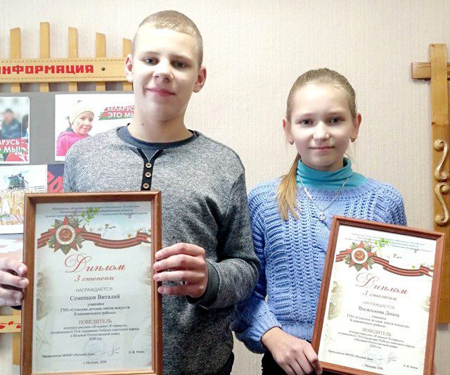 Участников было много, и тем ценнее награды наших юных талантливых земляков. Дипломами 3 степени были награждены Виталий Семенцов (возрастная категория от 12 до 16 лет) и Диана Василькова (возрастная группа до 12 лет). Виталий на суд жюри представлял графическую работу «Детство, войной опаленное», Диана — работу под названием «Материнская защита». К конкурсу ребят готовила учитель по классу «Изобразительное искусство» Наталья Евгеньевна Василькова.
