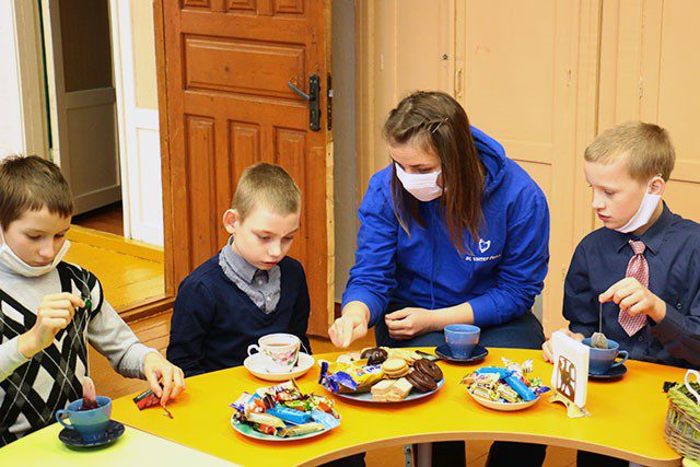 Для детей было организовано чаепитие, а также им показали небольшое театрализованное представление, во время которого Дед Мороз и Снегурочка раздавали ребятам подарки.
