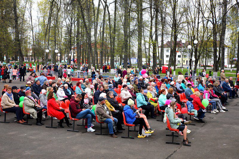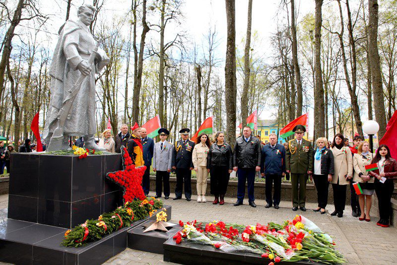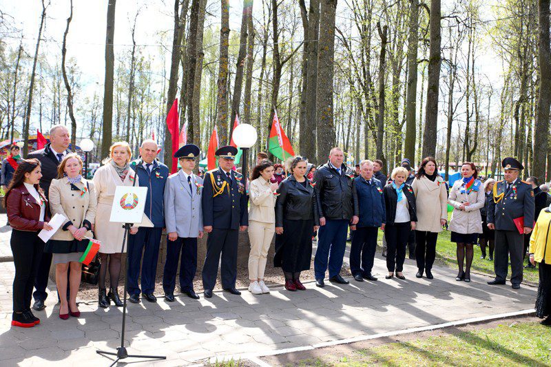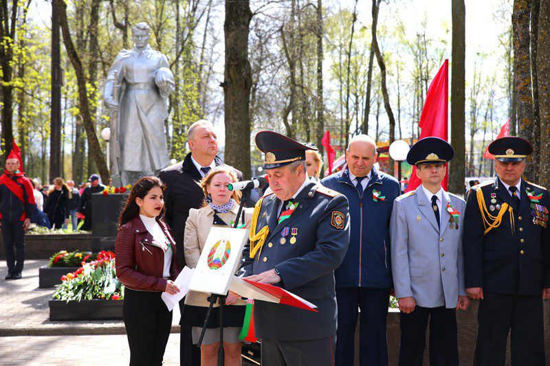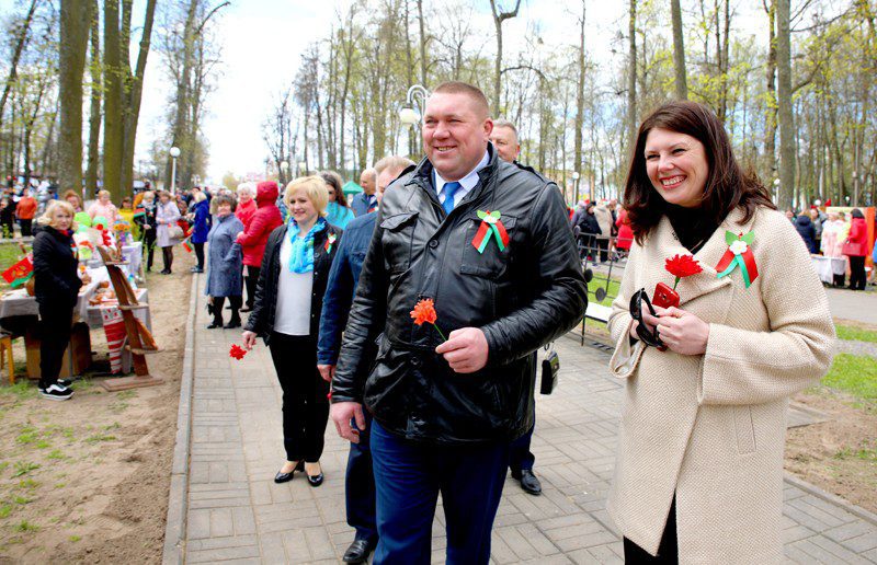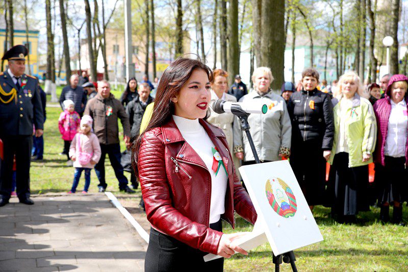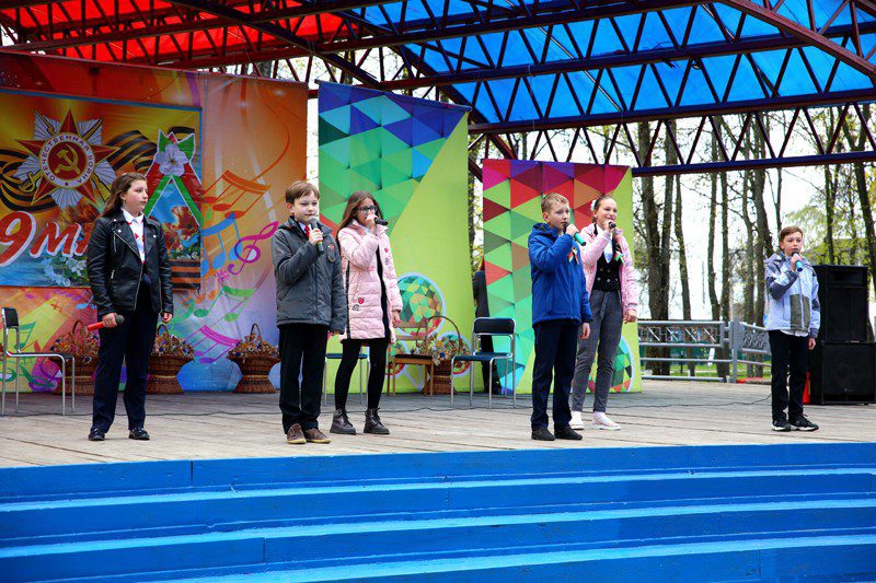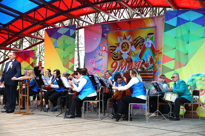 Сегодня в городском парке работают тематические площадки и торговые точки. На сцене амфитеатра состоялся праздничный концерт «Нашей Победе — 76!». Его открыла республиканская акция РОО «Белая Русь» «Вальс Победы».