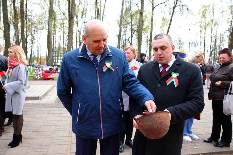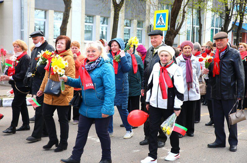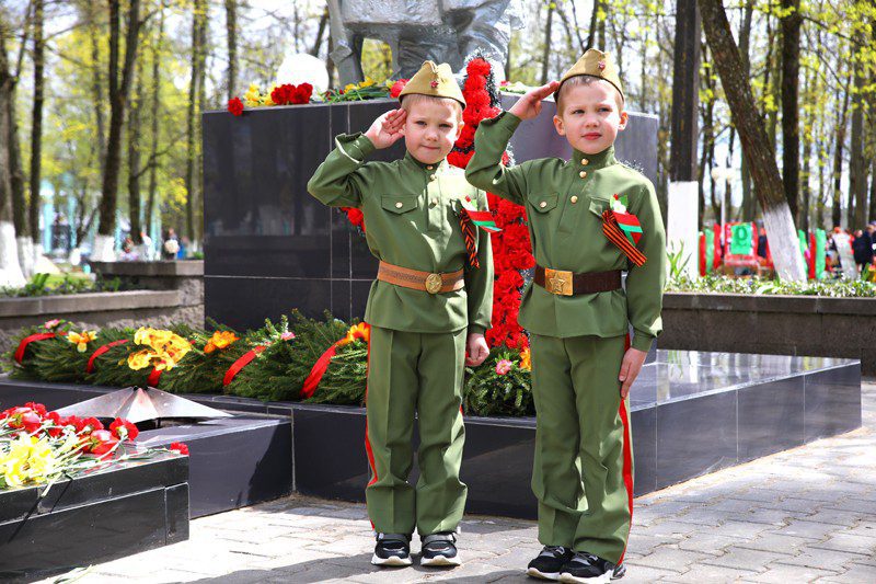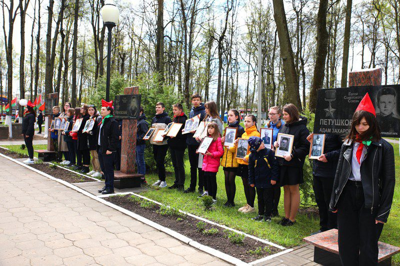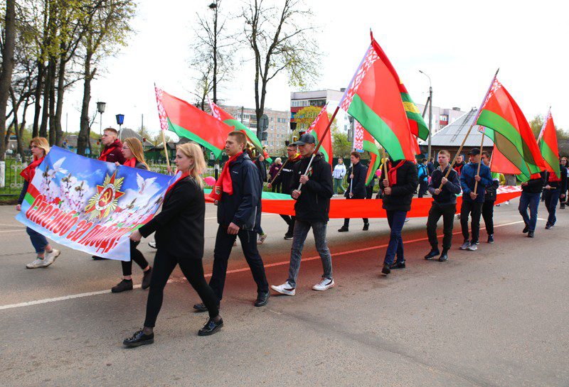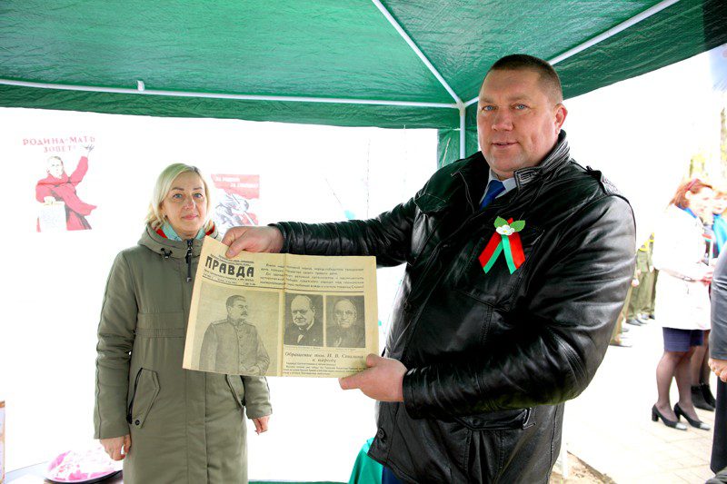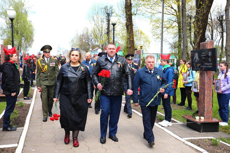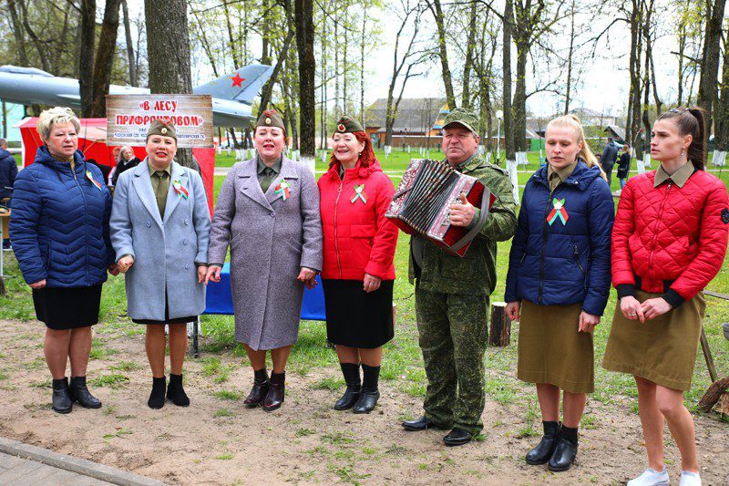 Сегодня в городском парке работают тематические площадки и торговые точки. На сцене амфитеатра состоялся праздничный концерт «Нашей Победе — 76!». Его открыла республиканская акция РОО «Белая Русь» «Вальс Победы».