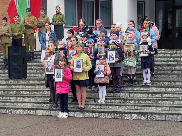 Учащиеся 1 — 8-х классов торжественно пронесли портреты своих прапрадедов, отдавших жизнь за Победу.