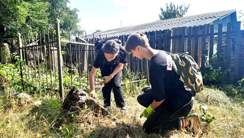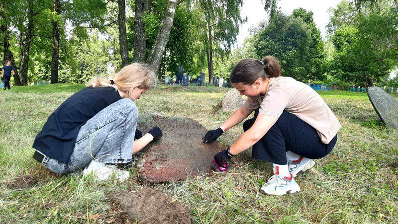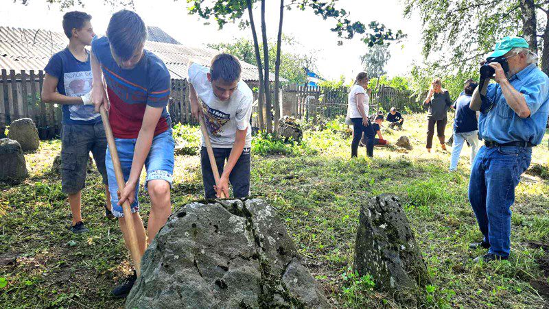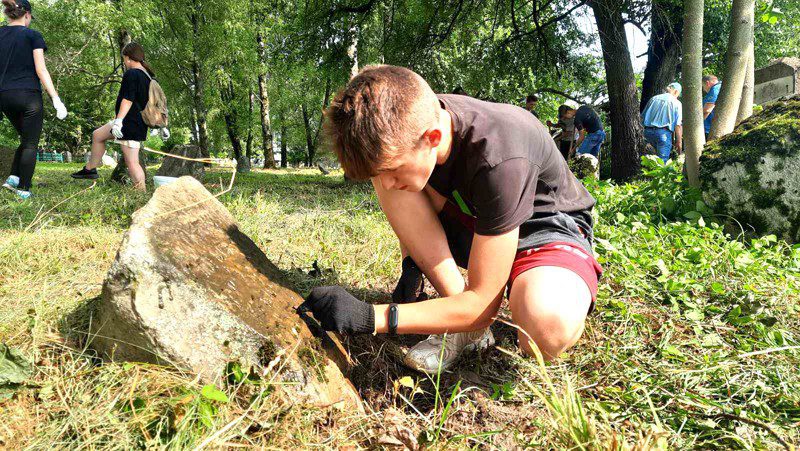 Большинство волонтеров — учителя и учащиеся СШ № 3. Ребята и взрослые освобождали камни от земли и растительности, чтобы можно было прочесть надписи.