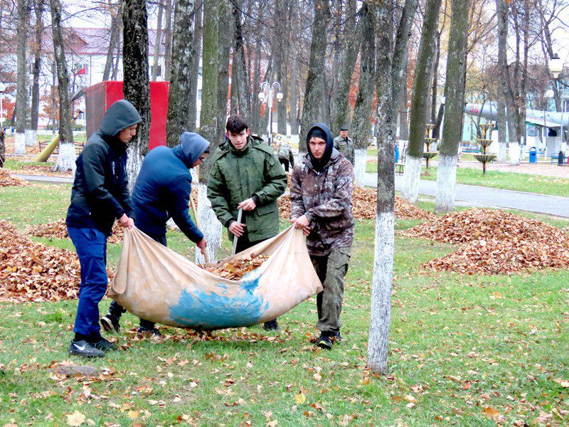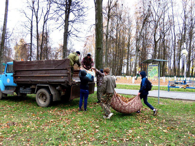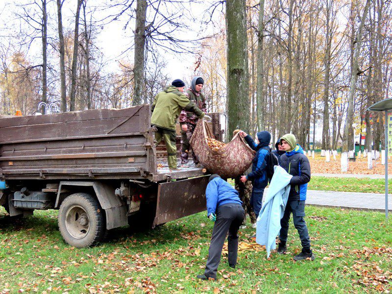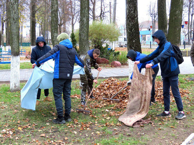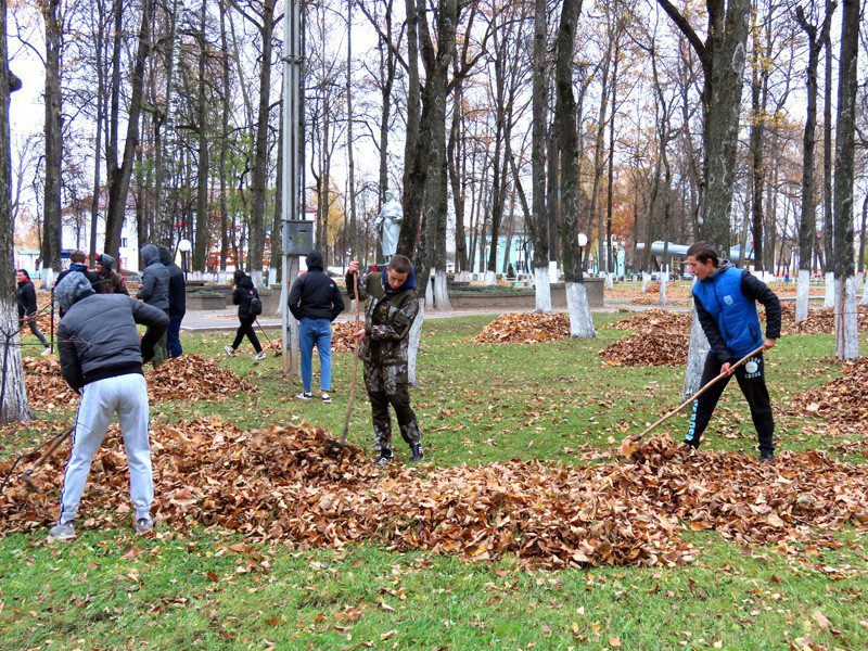 Школьники и учащиеся Климовичского государственного аграрного колледжа убирают листву в городском парке. Вместе со взрослыми ребята делают Климовичи ухоженными и красивыми.