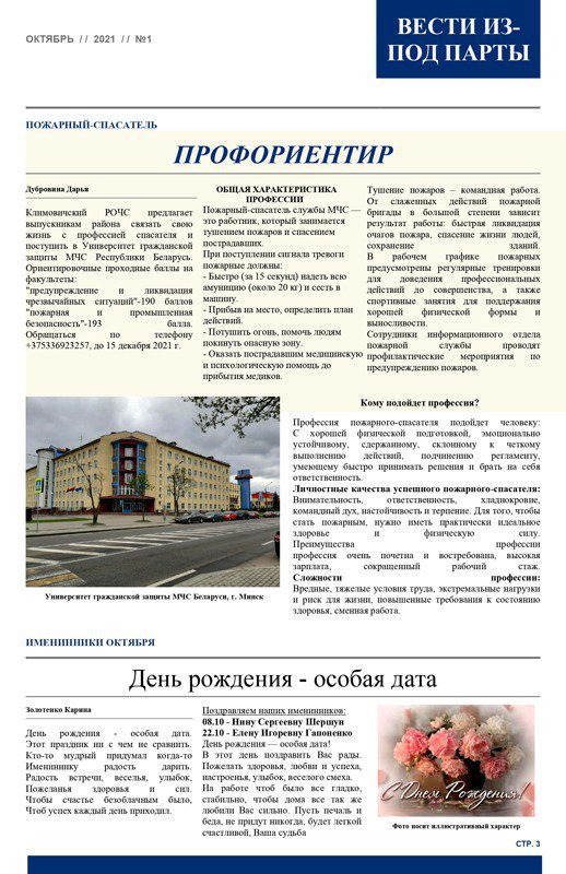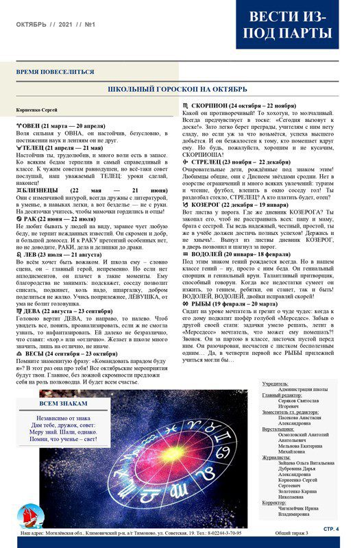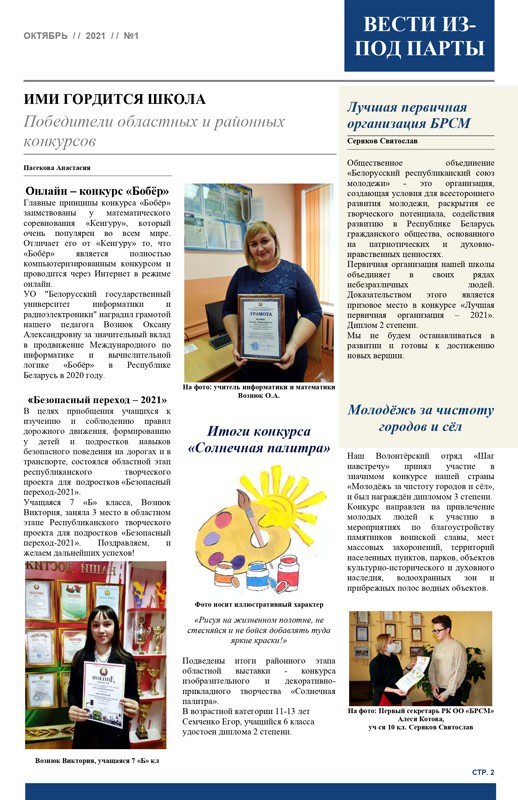 — Ребята сами решили, кто будет главным редактором, его заместителем, верстальщиками и корреспондентами, — рассказывает заместитель директора по воспитательной работе учреждения образования Ирина Ильющенко. — Планирование номера, сбор материала, обработка фотографий, работа над версткой и оформлением газеты, печать номеров — задачи, с которыми нужно справляться ученическому пресс-центру. Популярными в газете стали рубрики: «События месяца», «Ими гордится школа», «ПрофОриентир», «Именинники месяца», «Время повеселиться».
