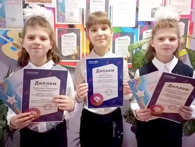 В Международной олимпиаде по сольфеджио и музыкальной литературе SolFest (г.Вологда, Российская Федерация) дипломами первой степени награждены учащийся 3 класса Арсений Емельянов, учащиеся 6 класса Диана Василькова и Анастасия Власенко, учащаяся 7 класса Виктория Ефремова. Причем они стали победителями в трех номинациях.