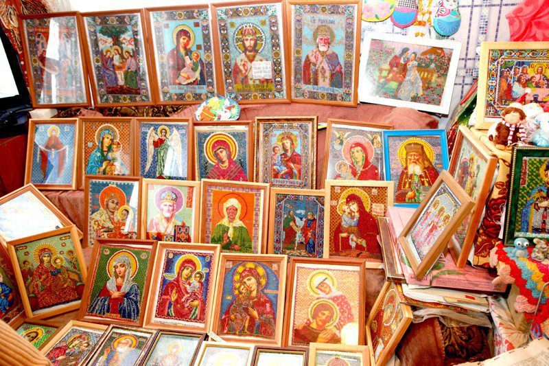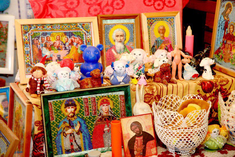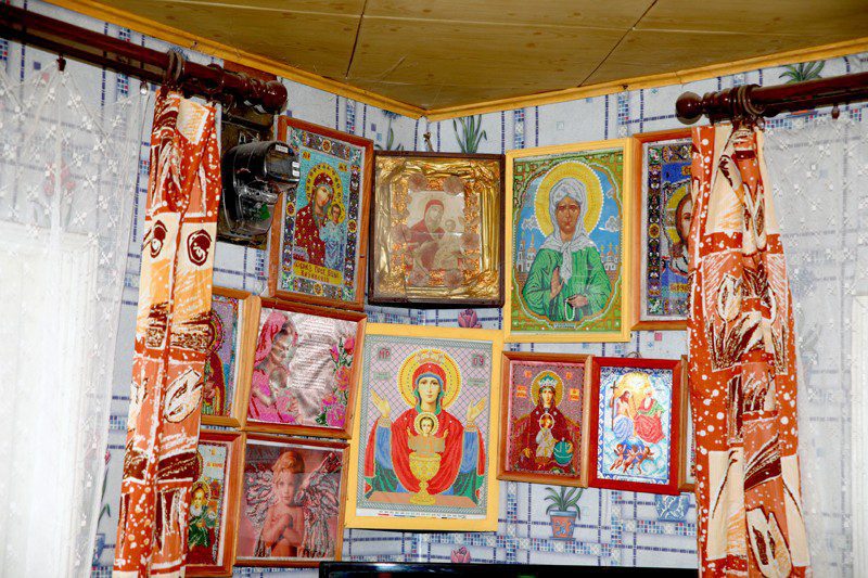Лидия Ивановна Кобзаренко сама из Тимоново. Так получилось, что ее и младшую сестру мать воспитывала одна. После восьми классов школы девушка поступила в Климовичский совхоз-техникум, где получила специальность зоотехника. Но работать в местное хозяйство пошла дояркой. Вскоре вышла замуж за парня с Украины. В семье родились трое детей: Сергей, Галина и Снежана. Так сложилось, что брак распался, и сына с дочерьми поднимать на ноги Лидии Ивановне пришлось одной. Поэтому и работала всю жизнь много и тяжело. Выйдя на пенсию, завела дома большое хозяйство. Не могла без дела сидеть. Сейчас уже здоровье не то, чтобы с большим поголовьем скота справляться, но все равно в сараях куры и кролики имеются. Само собой, огород есть. Но главное увлечение последние лет семь для Лидии Кобзаренко — это рукоделие. Однажды побывав в отделении дневного пребывания для инвалидов и граждан пожилого возраста Климовичского РЦСОН, она увидела красивейшие картины из кожи. Захотелось сделать такие же своими руками. Записалась в кружок «Мозаика», руководителем которого является Татьяна Григорьевна Шалыгина, и потихонечку начала учиться азам этого рукоделия. Очень скоро Лидия Ивановна уже своими руками изготавливала настоящие шедевры — картины, на которых красовались букеты из самых различных цветов, выполненных из кожи. А вот вышивать бисером женщину научила индивидуальный предприниматель Виктория Залесовская. Именно она терпеливо объясняла пенсионерке, как делать стежки аккуратными, чем удерживать материал, чтобы не сколь-зил, и т. д. Сейчас Лидия Ивановна и дня прожить не может без своего нового увлечения. Включает телевизор, ставит на колени специальный станок, на котором закреплен материал, берет в руки иголку, бисер… Стежок за стежком — и вырисовывается красочная икона. В последнее время полюбилось ей вышивать лики святых. Говорит, за такой работой просто душа и сердце поют.