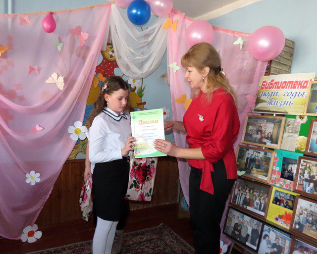 Вот и в ходе праздничного мероприятия были отмечены дипломами и подарками активные и преданные библиотеке читатели. Самой читающей семьей признана семья Дмитриевых, а самым юным читателем — Даниил Дмитриев. В номинации «Лидер по чтению» победителем стала Анастасия Сушко. Девушка за год прочитала 145 книг, причем произведения были самых разных жанров. Номинации «Самый толстый формуляр» была удостоена Людмила Ишутина. Самым активным читателем признана София Столярова. Девочка посещала библиотеку наибольшее количество раз. В номинации «Книжный однолюб» победила Оксана Кодатенко. Оксана Григорьевна отдает предпочтение чтению книг только одного жанра.