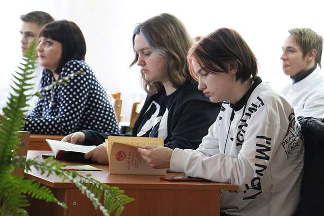 В рамках празднования Дня Конституции Республики Беларусь с учащимися УО «Климовичский государственный аграрный колледж» встретились первый секретарь райкома ОО «БРСМ» Алеся Котова, главный хранитель фондов районного краеведческого музея Яна Законникова, заместитель директора колледжа по воспитательной работе Людмила Филинова.