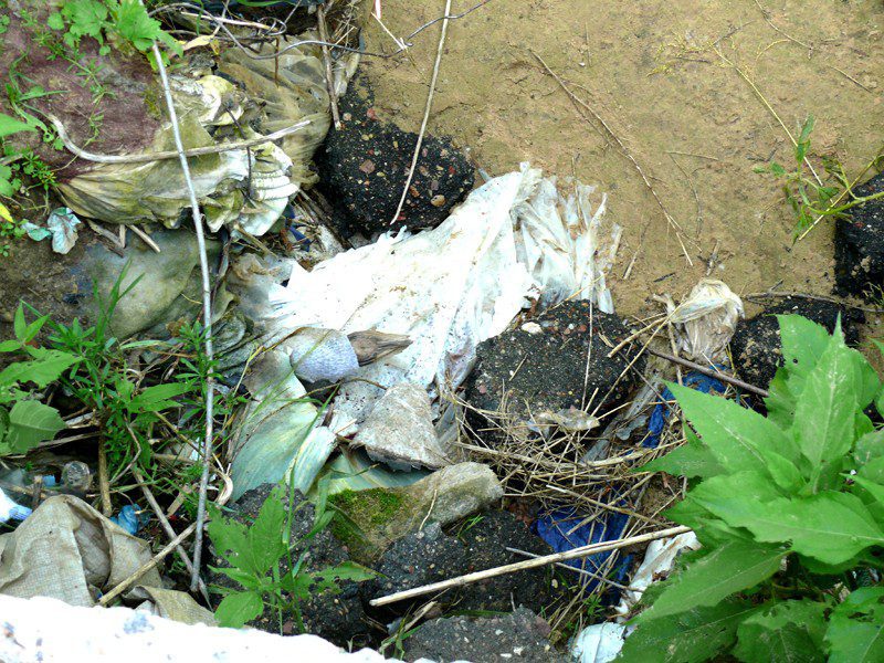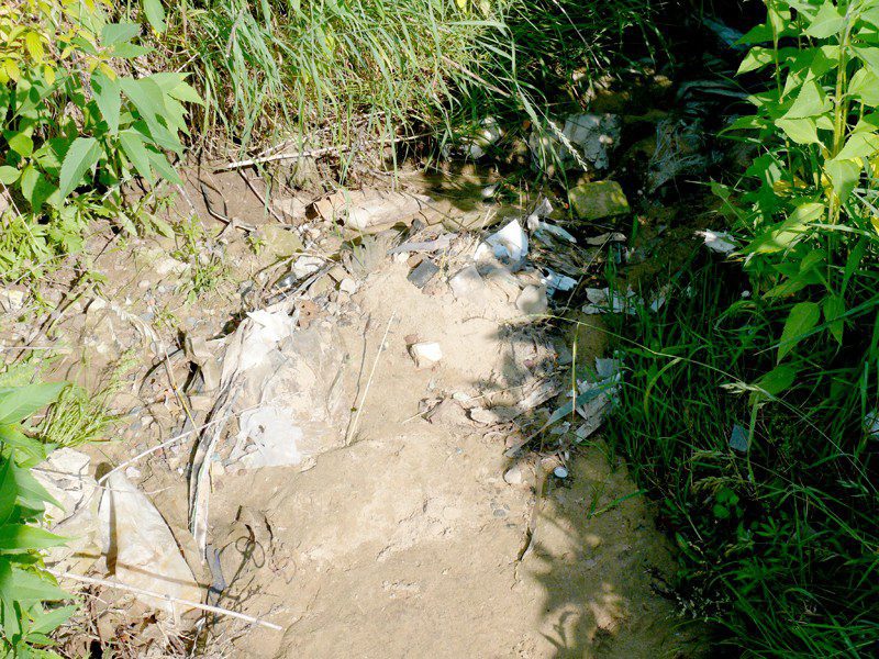 Такая же хаотичная помойка расположилась между гаражным кооперативом и общежитием № 5, что на ул. Кирова. За железобетонным лотком для стока воды огромная канава. Именно сюда кто-то повадился сносить всякий ненужный хлам, и во время больших дождей весь этот мелкий и крупногабаритный мусор потоками воды сносится куда-то дальше, в глубь зарослей. А кое-какие тряпки, коврики, жестянки намертво прилипли к земле. Часть ветоши практически сгнившая. Отвратительное зрелище.