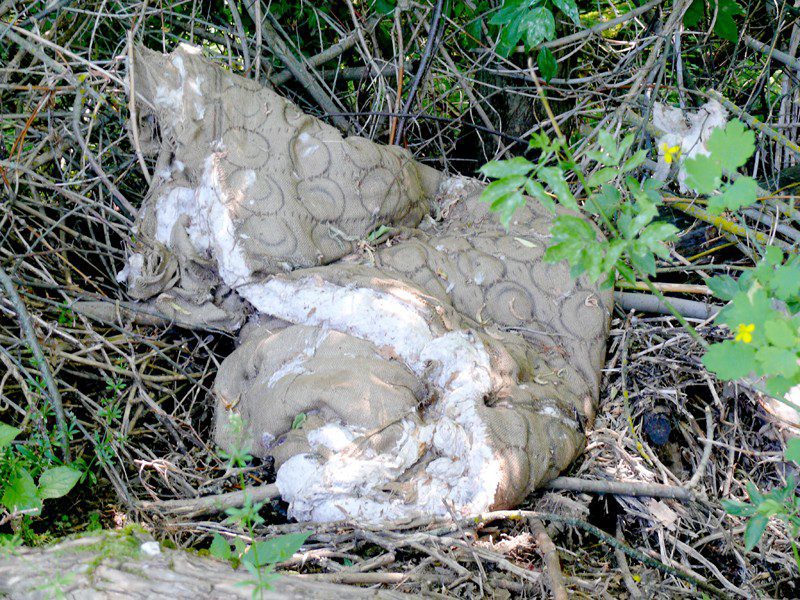 За детским садиком «Елочка» возле гаражей небольшая лесопосадка. Красиво. Идем по тропинке. Слева привлекает внимание что-то длинное и белое. Подходим ближе — это огромное полотно спанбонда. А рядом бутылки, коробки, бумажки — всего и не перечесть. Многое из бытового мусора надежно спряталось в высокой траве.
