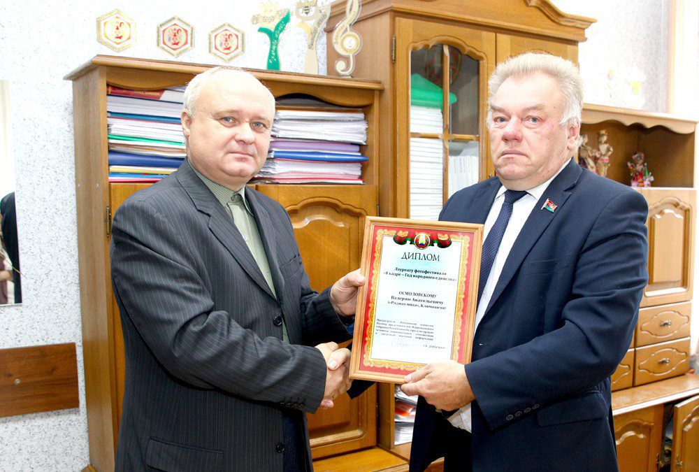Владимир Николаевич вручил диплом корреспонденту районной газеты Валерию Осмоловскому, который стал лауреатом фотофестиваля «В кадре — Год народного единства».