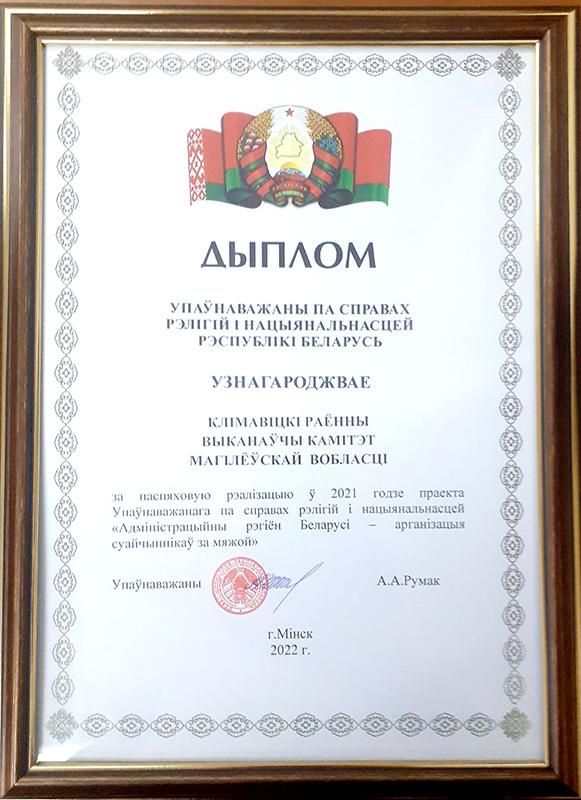 За успешную реализацию проекта Уполномоченного по делам религий и национальностей «Административный регион Беларуси — организация соотечественников за рубежом» Климовичский райисполком был награжден дипломом.