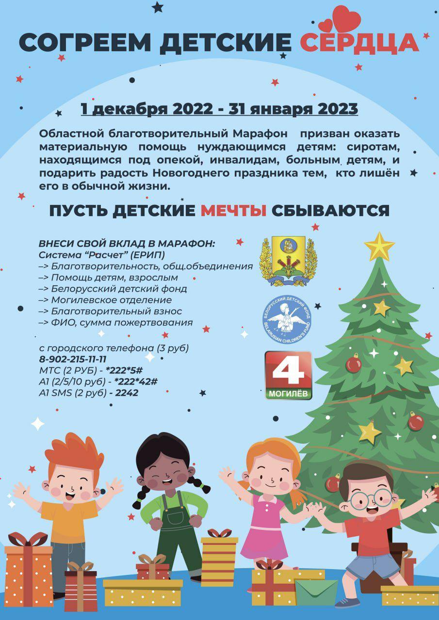 1 декабря стартовал 11-й областной благотворительный марафон «Согреем детские сердца», проводимый Могилевским областным отделением РОО «Белорусский детский фонд» при поддержке Могилевского областного исполнительного комитета в период с 1.12.2022 по 31.01.2023 гг.