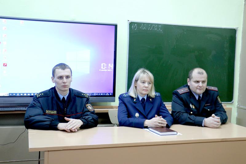 Старший помощник прокурора Климовичского района Наталья Гапеева, начальник инспекции по делам несовершеннолетних Денис Герасимов, старший оперуполномоченный группы наркоконтроля и противодействия торговле людьми Юрий Кучерявый посещают школы района.