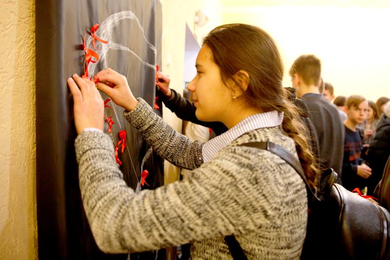 По окончании встречи ее участники сложили красные ленточки в один общий большой символ надежды.