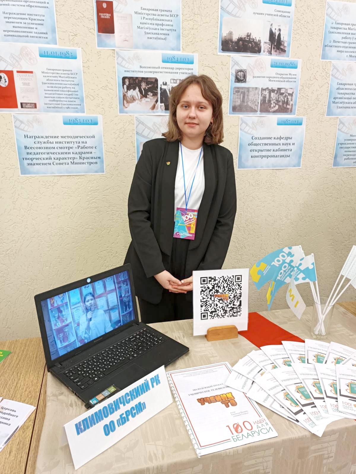 В Могилеве состоялся областной тур республиканского молодежного проекта «100 идей для Беларуси», который собрал 55 участников с авторскими проектами. Климовичский район представляла учащаяся Тимоновской средней школы Валерия Кашанская с проектом ученическое телевидение «Ученик ТВ».