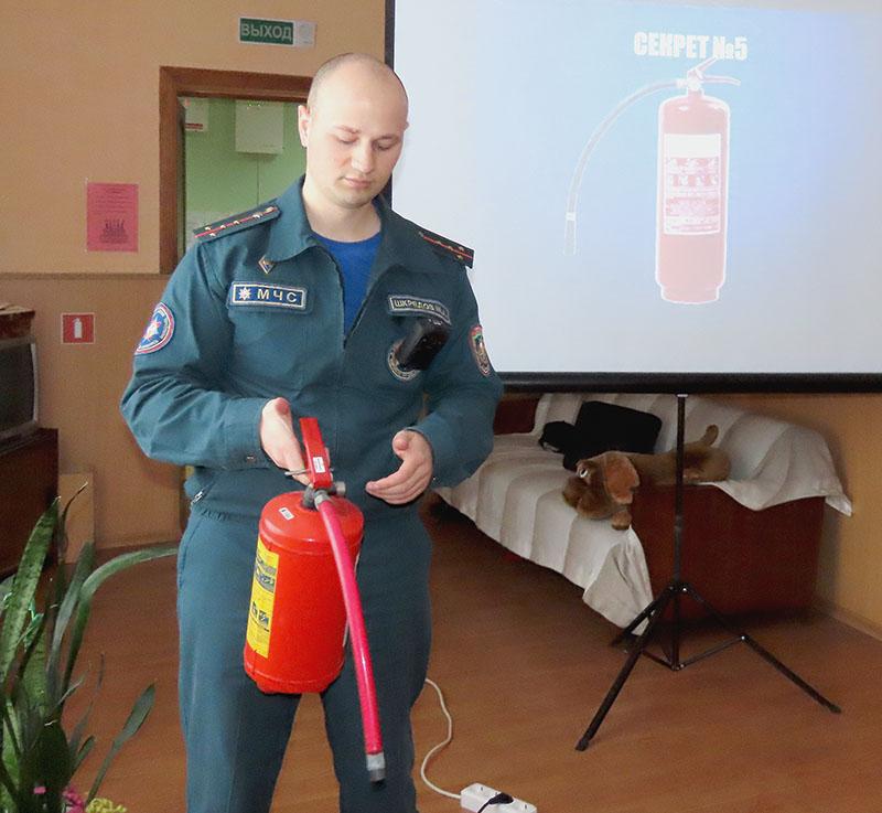 Максим Шкредов напомнил участникам мероприятия о правилах безопасности при эксплуатации печного отопления, о правилах пользования огнетушителем в случае чрезвычайной ситуации. Показал примеры последствия неисправности печей, а также неосторожного обращения с огнем при курении.