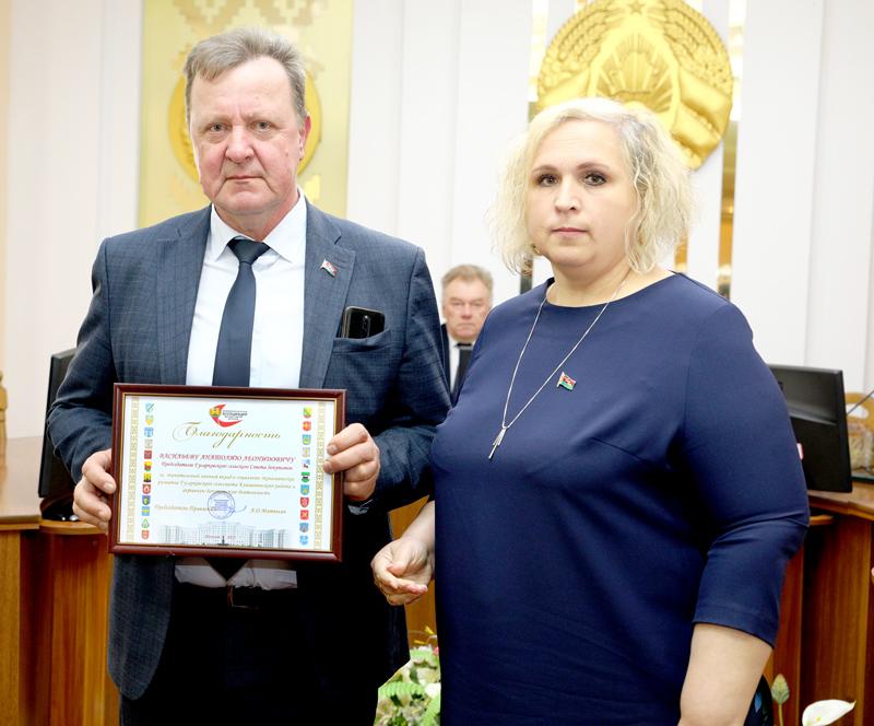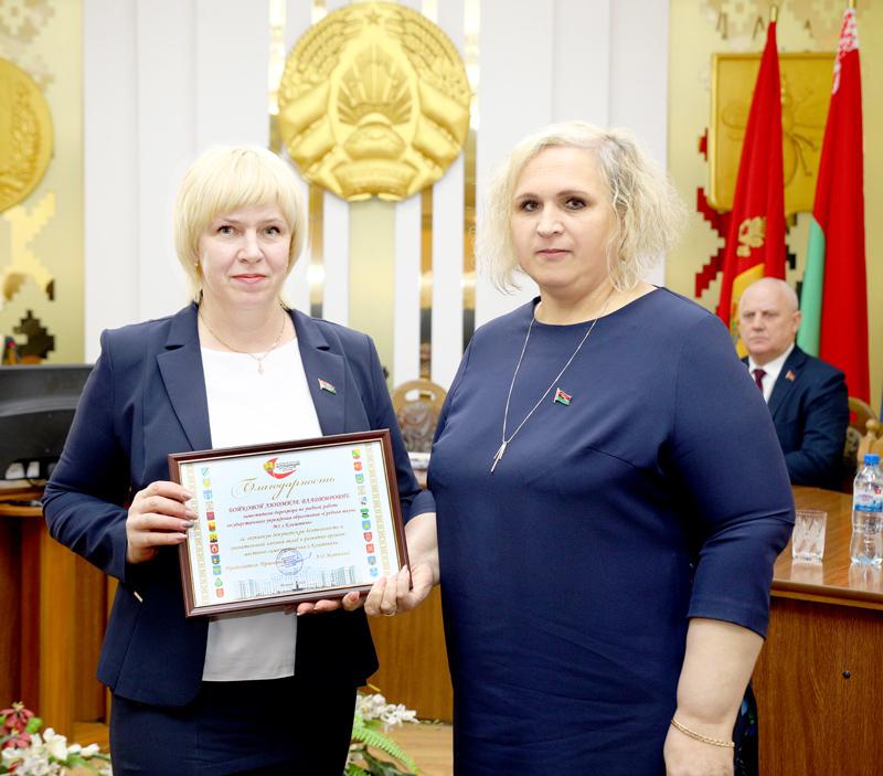 Лидер депутатского корпуса Климовщины Наталья Асмоловская вручила благодарности Могилевской областной ассоциации местных Советов депутатов председателю Гусарковского сельского Совета депутатов Анатолию Васильеву и заместителю директора первой городской школы, депутату районного Совета депутатов Людмиле Бойковой.